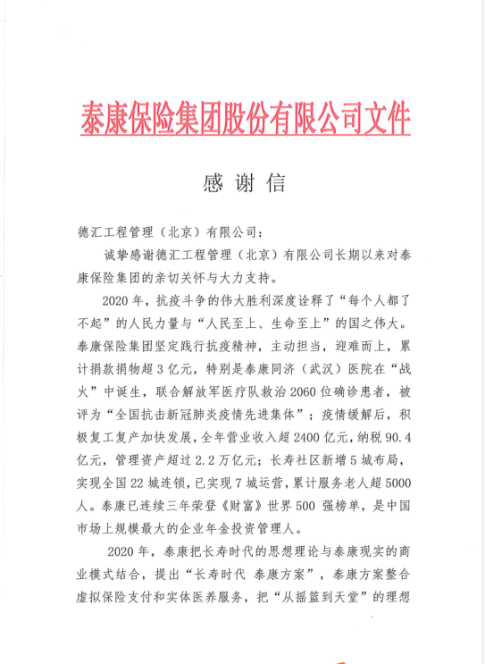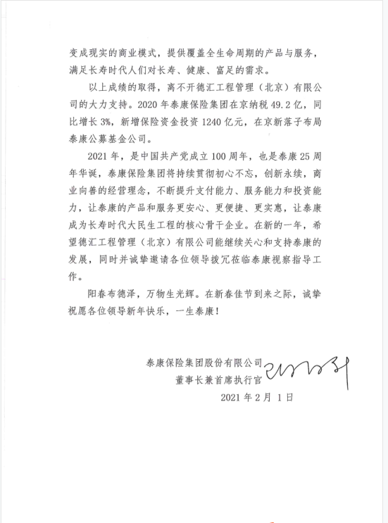 2021年新年工作伊始,公司收到了业主泰康保险集团股份有限公司发来的感谢信!